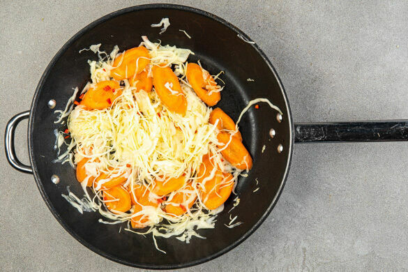 Die Karotten und den Weißkohl in der Hackfleischpfanne mit 2EL Pflanzenöl bei mittlerer Hitze 2–3Min. anbraten. Die Peperoni unterheben, mit Salz und Pfeffer abschmecken und weitere 1–2Min. braten, dann aus der Pfanne nehmen. Die Limette halbieren, eine Hälfte auspressen und die andere Hälfte in 4 Spalten schneiden.