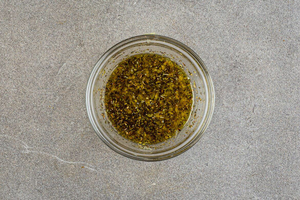 Den Knoblauch und die gewürfelten Oliven mit 1TL Oregano, 1TL Zitronenschale, dem Zitronensaft, 2EL Olivenöl sowie je ½TL Salz und Pfeffer verrühren. Ein Backblech mit Backpapier auslegen.