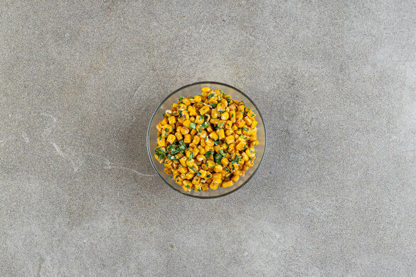 Den Koriander samt Stängeln grob schneiden. Den Knoblauch schälen und fein würfeln, dann mit der ½ des Korianders, der ½ des restlichen Limettensafts und 1TL Mayonnaise unter den Mais rühren. Die Mais-Salsa mit Salz und Pfeffer abschmecken.
