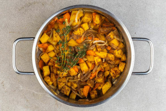 Die Steckrüben und die Karotten in einem mittelgroßen Topf mit 2EL Olivenöl und je 1 kräftigen Prise Salz und Pfeffer bei mittlerer Hitze 3–5Min. braten. Die Zwiebeln, den Knoblauch und die Misopaste hinzugeben und 3–4Min. mitbraten. Die Gewürzmischung und die ½ des Thymians samt Stiele hinzugeben und 30–60Sek. duftend braten.