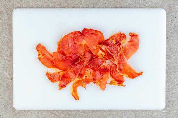 Das Brötchen in mundgerechte Stücke schneiden und mit 2EL Olivenöl und je 1 kräftigen Prise Salz und Pfeffer bestreuen, dann auf einer Hälfte eines mit Backpapier ausgelegten Backbleches verteilen. Den Schinken auf der anderen Hälfte auslegen. Die Croûtons und den Schinken in 6–8Min. im Ofen knusprig backen. Inzwischen den Schnittlauch in kleine Röllchen schneiden.