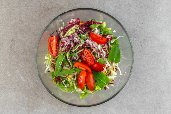 Die Tomaten in Spalten schneiden. Die Minzeblätter von den Stängeln zupfen und ggf. nach Belieben in Streifen schneiden. Die Tomaten und die Minze mit dem Salat vermengen, mit Salz und Pfeffer abschmecken.