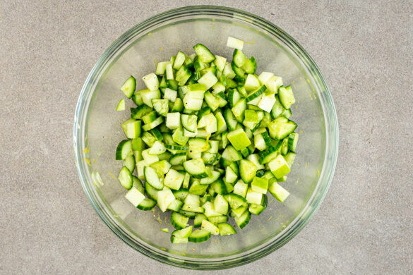 Die Gurke längs vierteln und in ca. 1cm kleine Würfel schneiden. Den Apfel vierteln, entkernen und ebenfalls in ca. 1cm große Würfel schneiden. Die Zitronenschale abreiben, dann die Zitrone halbieren und auspressen. Die Gurken und die Äpfel mit der Zitronenschale, der 1/2 des Zitronensafts und je 1 Prise Salz und Pfeffer zu einem Salat vermengen.