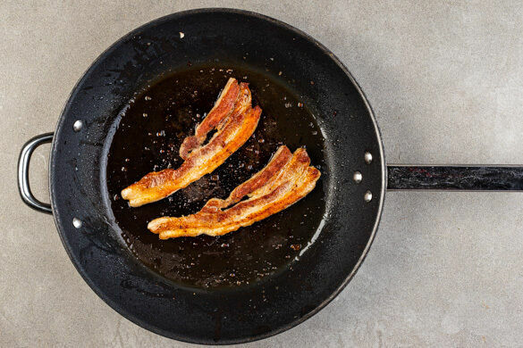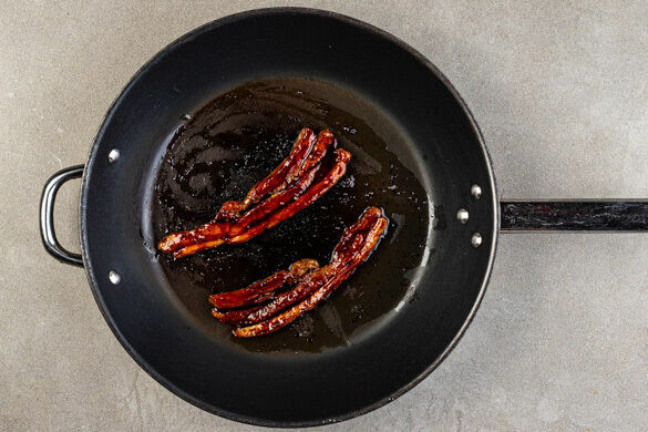 Das Bratfett mit einem Löffel aus der Pfanne entfernen, dabei ca. 1EL Bratfett aufbewahren und beiseitestellen. Die Sauce in die Pfanne geben und bei niedriger Hitze erwärmen. Das Fleisch in der Sauce wenden, bis es vollständig bedeckt ist, dann aus der Pfanne nehmen und beiseitestellen.