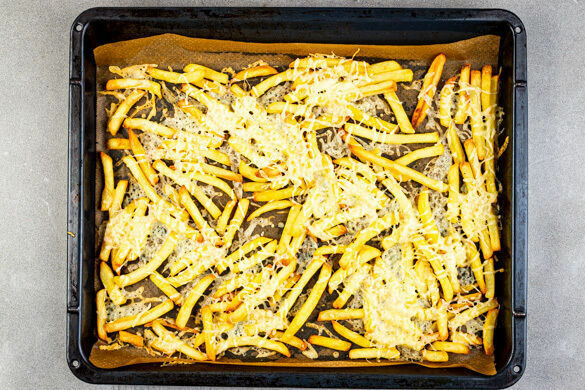Die Pommes aus dem Ofen nehmen und mit dem Käse bestreuen, dann zurück in den Ofen geben und weitere 3–5Min. backen, bis der Käse geschmolzen ist.