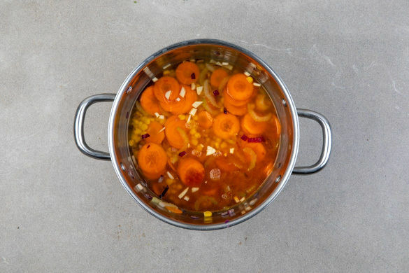 Die Karotten, den Sellerie und die Zwiebeln in einem mittelgroßen Topf mit 1EL Olivenöl und 1 Prise Salz bei mittlerer Hitze 2–3Min. anbraten. Den Knoblauch schälen und fein würfeln, dann mit dem Mais und der ½ des geräucherten Paprikapulvers ebenfalls in den Topf geben und 3–4Min. mitbraten.