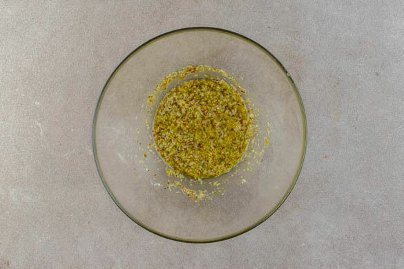 Die Zitrone halbieren und auspressen. Den Käse fein reiben. Die ½ des Käses mit 2EL Olivenöl, 1EL Zitronensaft, 1TL körnigem Senf und der restlichen Gewürzmischung verrühren, ggf. mit ½–1TL Wasser verdünnen.