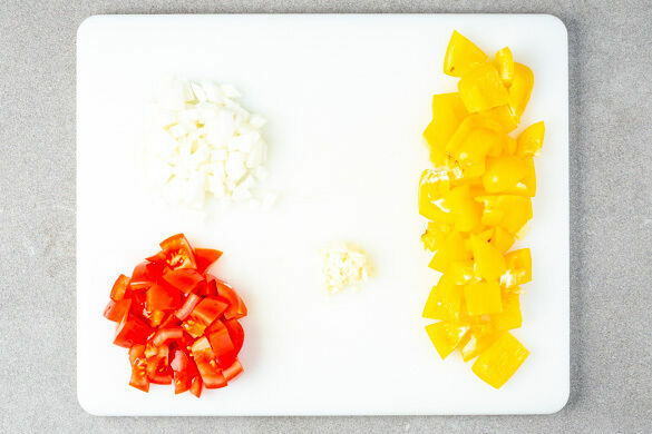 Die Paprika vierteln, entkernen und in kleine Würfel schneiden. Die Zwiebel schälen, halbieren und fein würfeln. Die übrige Knoblauchzehe schälen und ebenfalls fein würfeln. Die Tomaten in grobe Stücke schneiden.