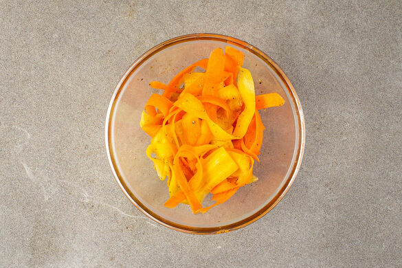 Die Karotten ggf. schälen und mit einem Sparschäler in feine Streifen schneiden. Den restlichen Limettensaft mit 1TL Limettenschale, ½TL Kreuzkümmel-Gewürzmischung, 1TL Honig, 1EL Pflanzenöl und je 1 Prise Salz und Pfeffer verrühren. Die Karottenstreifen mit dem Dressing vermengen und nach Belieben mit mehr Kreuzkümmel-Gewürzmischung abschmecken.