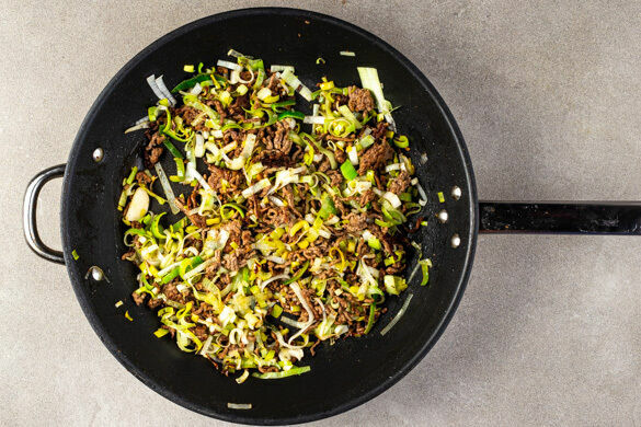 Den Lauch und den Knoblauch hinzufügen und bei mittlerer Hitze in 5–6Min. weich braten. Die Hackfleischfüllung nach Geschmack mit der ½ des Limettensafts sowie Salz und Pfeffer verfeinern.