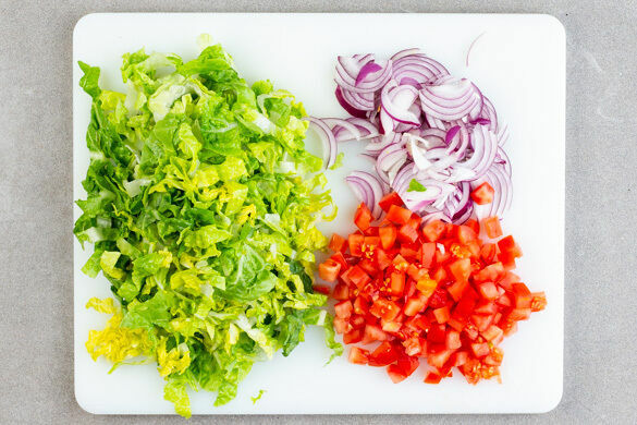 Den Salat in dünne Streifen schneiden, dabei den Strunk entfernen. Die Zwiebel schälen, halbieren und in feine Streifen schneiden. Die Tomaten klein würfeln.