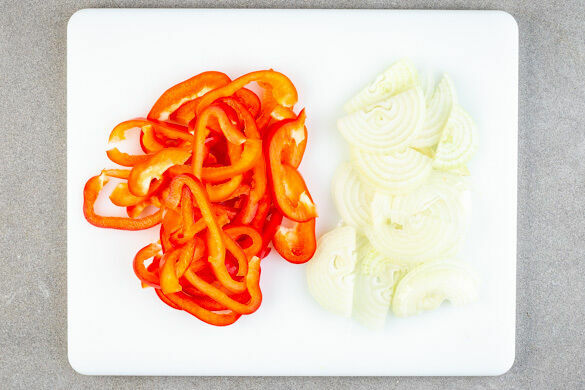 Den Backofen auf 200°C (180°C Umluft) vorheizen. Die Paprika vierteln, entkernen und in dünne Streifen schneiden. Die Zwiebel schälen, halbieren und in feine Streifen schneiden.