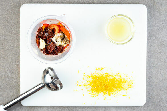 Den Knoblauch schälen. ½TL der Zitronenschale fein abreiben, dann die Zitrone halbieren und auspressen. Die getrockneten Tomaten grob würfeln. Die ½ der Paprikastreifen mit dem Knoblauch, 1EL Zitronensaft, den getrockneten Tomaten, 2EL Mayonnaise und 1EL Olivenöl in einem hohen Gefäß pürieren. Mit Salz und Pfeffer abschmecken.