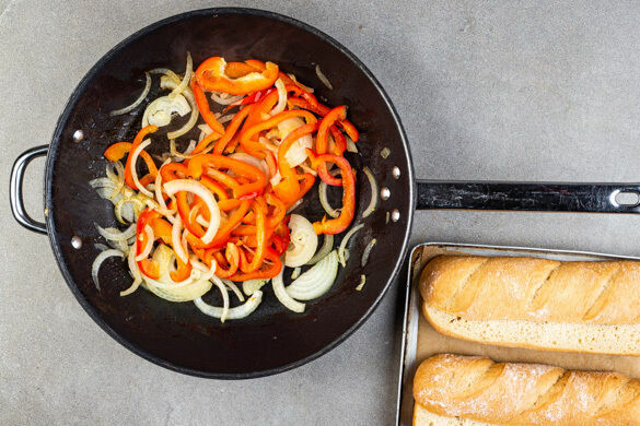 Die Paprika und die Zwiebeln in einer großen Pfanne mit 2EL Olivenöl bei starker Hitze 4–5Min. anbraten, dabei ab und an umrühren. Tipp: Wer mag, kann Zwiebeln und Paprika auch getrennt in zwei Pfannen anbraten, da die Paprika später separat weiterverarbeitet wird. Die Brötchen aufschneiden und auf zwei mit Backpapier ausgelegten Backblechen 2–3Min. im Ofen aufbacken.