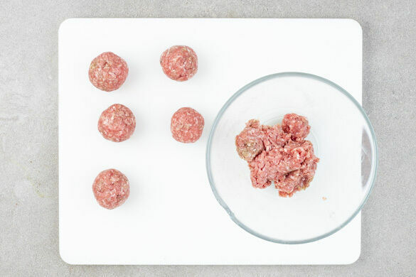 Das Hackfleisch mit den Chiliflocken samt Flüssigkeit und 1TL Salz verkneten und mit angefeuchteten Händen zu ca. 32 Bällchen formen. Tipp: Das Hackfleisch zuerst halbieren, dann vierteln usw., bis 32 gleich große Portionen entstanden sind.