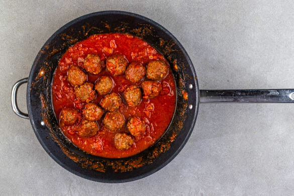 Die Fleischbällchen in zwei großen Pfannen mit je 2EL Olivenöl bei mittlerer bis starker Hitze rundum ca. 2Min. goldbraun anbraten. Den Knoblauch und die restliche Gewürzmischung unterrühren und ca. 1Min. mitbraten.
