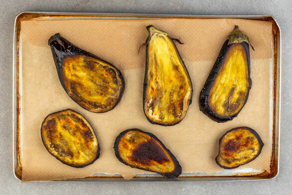 Die Auberginen längs in ca. 1cm breite Scheiben schneiden, mit ½TL Salz würzen und mit 4EL Olivenöl einreiben. Auf ein mit Backpapier ausgelegtes Backblech legen und auf der dritten Schiene unter dem Grill ca. 20Min. im Ofen backen. Die Auberginen nach ca. 10Min. wenden.