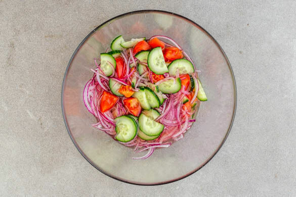 Die Zwiebeln schälen, halbieren und in dünne Streifen schneiden. Die Tomaten grob würfeln. Die Gurke längs halbieren, dann quer in dünne Scheiben schneiden. 200ml Wasser, 200ml Essig, 2EL Zucker und 1EL Salz in einem mittelgroßen Topf zum Kochen bringen, dabei rühren. Das Gemüse mit der Lake bedecken und mit einem Papiertuch abdecken, um die Oberfläche zu befeuchten.