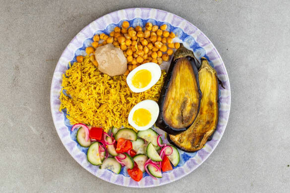 Wir finden es immer so schön, wenn der Teller voller bunter Zutaten ist und auch noch köstlich schmeckt. Heute gibt es fein gebackene Auberginen, einen eingelegten Gemüsemix – aus knackigen Gurken, fruchtigen Tomaten und roten Zwiebeln –, würzigen Basmatireis, Kichererbsen, gekochte Eier und noch einen schicken Kleckser Tahini. Man weiß gar nicht, wo man als Erstes reinbeißen soll. Jedenfalls wünschen wir einen guten Appetit!