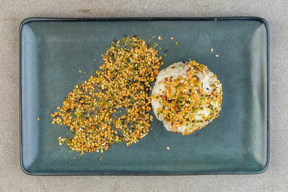 Die Gewürzmischung auf einen flachen Teller geben. In einer Schüssel etwas kaltes Wasser bereitstellen. Jeweils eine Handvoll Reis mit angefeuchteten Händen glatt drücken. Ca. 1EL Fisch in die Mitte des Reises geben, dann die Hand zusammenfalten, um den Fisch mit dem Reis zu umhüllen. Bei Bedarf etwas mehr Reis verwenden, um die Hülle zu schließen.