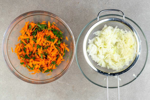 Möglichst viel überschüssiges Wasser aus dem Kohlrabi herausdrücken, dann mit den Karotten vermengen.
