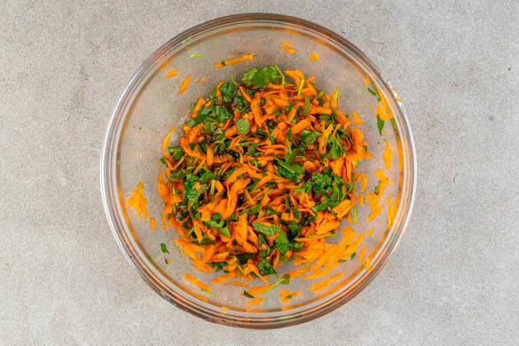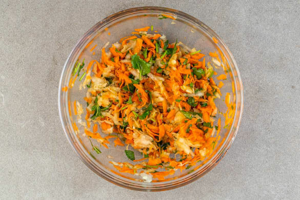 Möglichst viel überschüssiges Wasser aus dem Kohlrabi herausdrücken, dann mit den Karotten vermengen.