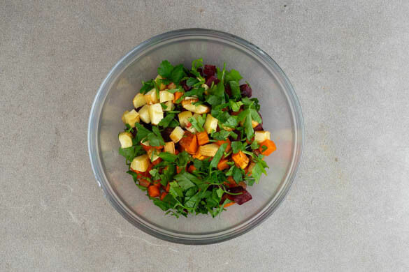 Den Backofen auf 200ºC (180ºC Umluft) vorheizen. Die Roten Beten schälen und würfeln. Tipp: Da Rote Bete stark färbt, beim Verarbeiten am besten Küchenhandschuhe und Schürze tragen. Die Zwiebeln schälen, halbieren und in Spalten schneiden. Die Karotten ggf. schälen und mit den Pastinaken und den Süßkartoffeln samt Schale in grobe Würfel schneiden.