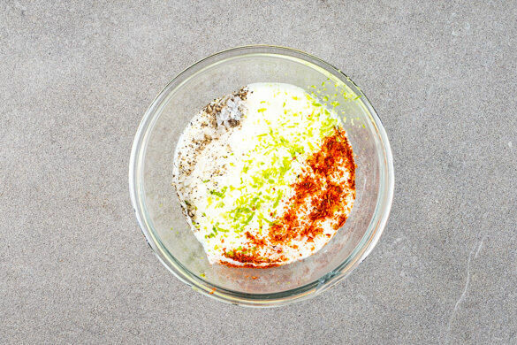 Die Limettenschale abreiben. Die Crème fraîche mit der Gewürzmischung nach Geschmack sowie je 1 Prise Salz und Pfeffer glatt rühren und mit der Limettenschale würzen.