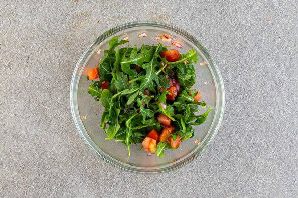 Die Tomaten in kleine Würfel schneiden. Die Zwiebel schälen, halbieren und fein würfeln. Die Tomaten und die ½ der Zwiebeln oder nach Geschmack mehr mit der restlichen Gewürzmischung, 1EL Ketchup und 1TL Zitronenschale vermengen und die Salsa mit Salz und Pfeffer abschmecken.