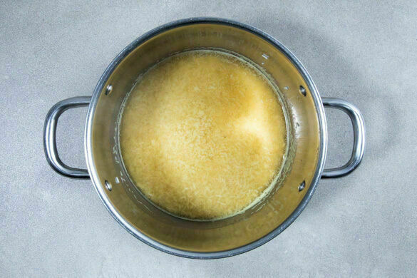 In einem großen Topf 900ml Wasser zum Kochen bringen. Den Reis in einem Sieb kalt abspülen, bis das Wasser klar bleibt. Sobald das Wasser kocht, den Reis und die ½ des Brühgewürzes hineingeben und abgedeckt bei niedrigster Hitze 10–12Min. kochen, bis das Wasser aufgesogen und der Reis gar ist. Noch ca. 5Min. ohne Hitzezufuhr ziehen lassen.