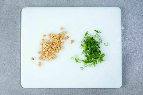 Den Ingwer, den Knoblauch und die Schalotten schälen und fein würfeln. Die Peperoni ebenfalls fein würfeln. Die Lauchzwiebeln in feine Ringe schneiden, das Grün für die Garnitur beiseitelegen. Alle Zutaten mit der ½ der Erdnüsse, der Sojasauce, dem 5-Gewürze-Pulver, dem restlichen Brühgewürz und 2EL Zucker in eine hitzebeständige Schüssel geben.