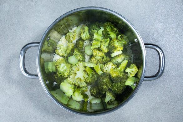Den Brokkoli in mundgerechte Röschen schneiden, den Brokkolistrunk ggf. schälen und in ca. 1cm dünne Scheiben schneiden. Den Brokkoli und die Strunkscheiben sogleich in den Topf zu dem Reis geben und abgedeckt mitköcheln, bis der Reis gar ist.