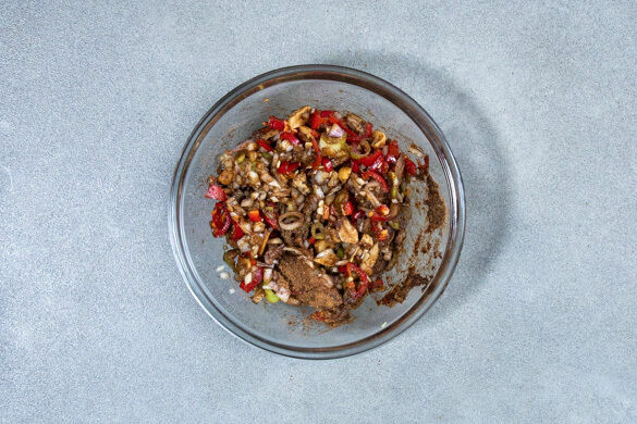 4EL Pflanzenöl in einer mittleren Pfanne bei starker Hitze erwärmen, bis es zu rauchen beginnt, dann das heiße Öl vorsichtig in die Schüssel mit den vorbereiteten Zutaten gießen. Das Peperoniöl zum Auskühlen beiseitestellen. Tipp: Indem das Öl erhitzt wird, nimmt es den Geschmack der Zutaten besonders gut auf und verstärkt diese. Sei kreativ und probiere verschiedene Kombinationen aus!