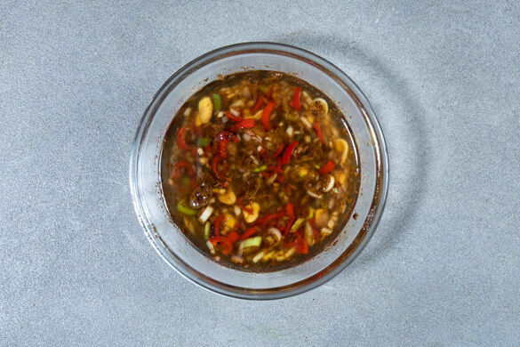 Den Ingwer, den Knoblauch und die Schalotte schälen und fein würfeln. Die Peperoni ebenfalls fein würfeln. Die Lauchzwiebel in feine Ringe schneiden, das Grün für die Garnitur beiseitelegen. Alle Zutaten mit der ½ der Erdnüsse, der Sojasauce, dem 5-Gewürze-Pulver, dem restlichen Brühgewürz und 1EL Zucker in eine hitzebeständige Schüssel geben.