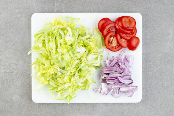 Die 1/2 des Salats in dünne Streifen schneiden, dabei den Strunk entfernen. Der übrige Salat wird für dieses Rezept nicht benötigt. Die Tomate in dünne Scheiben schneiden. Die Zwiebel schälen, halbieren und in dünne Streifen schneiden.