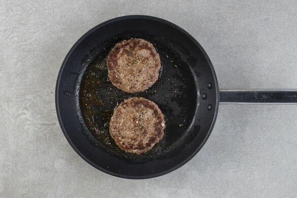 Die Pattys in einer mittelgroßen Pfanne mit 1TL Olivenöl bei mittlerer Hitze abgedeckt auf jeder Seite 5–6Min. goldbraun braten. Die Burgerbrötchen im Ofen 3–5Min. aufbacken.