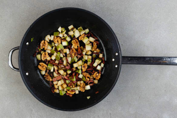 Den Bacon in einer großen Pfanne mit 1EL Olivenöl bei mittlerer bis starker Hitze 2–3Min. anbraten. Die Birnen und die Walnüsse zufügen. Den Bacon mit den Birnen und den Walnüssen 5–6Min. weiterbraten, bis er gebräunt und leicht knusprig ist. Das Topping mit 1EL Balsamicoessig vermengen, mit Salz und Pfeffer abschmecken und vom Herd nehmen.