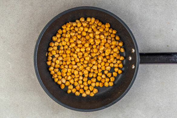 Die Kichererbsen in einem Sieb mit kaltem Wasser abspülen, abtropfen lassen und in einer mittelgroßen Pfanne mit 1EL Pflanzenöl bei starker Hitze 3–4Min. knusprig braten. In der letzten Minute die Gewürzmischung hinzugeben und mitbraten. Beiseitestellen und leicht abkühlen lassen.