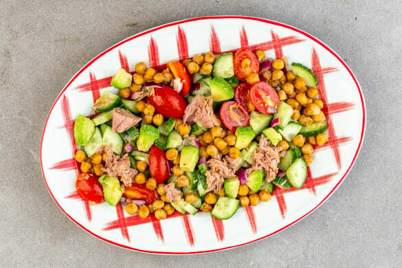 Dieser Salat kann sich sehen und schmecken lassen! Heute treffen Frische und Knusprigkeit aufeinander und wandern Hand in Hand direkt auf deinen Teller. Die Kichererbsen werden würzig aufgeknuspert, während Avocado, Tomaten, Gurken und Zwiebeln geschmeidig ihren Weg in das zitronige Dressing finden. Da fehlt noch was? Na, der vegane Thunfisch! Den haben wir nicht vergessen, sonst wäre es ja kein Salat für die Götter!