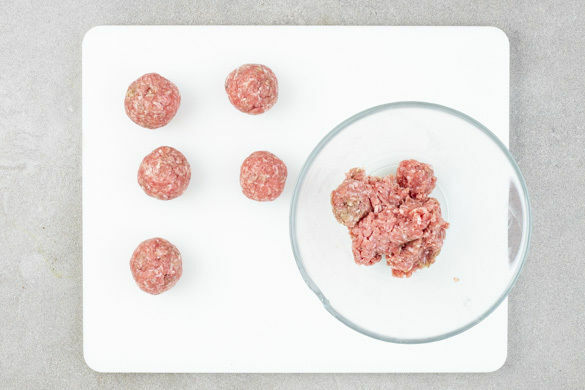Inzwischen den Knoblauch schälen und sehr fein würfeln oder durch eine Knoblauchpresse drücken. Das Hackfleisch mit der ½ des Knoblauchs sowie je 1 Prise Salz und Pfeffer verkneten. Mit feuchten Händen etwa walnussgroße Hackbällchen formen.