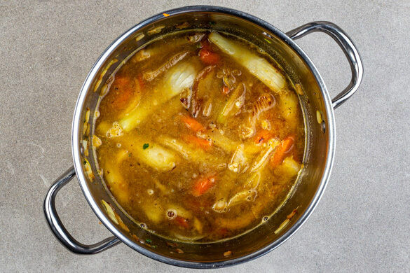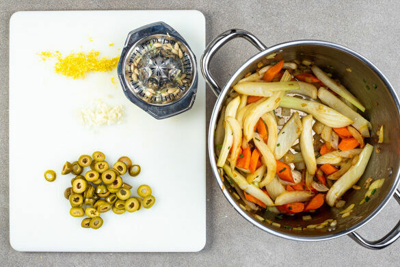 Die Zwiebeln, den Fenchel, die Karotten und die Petersilienstängel in einem großen Topf mit 4EL Olivenöl bei mittlerer bis niedriger Hitze 10–14Min. braten, dabei gelegentlich umrühren. Inzwischen die Oliven in Ringe schneiden. Den Knoblauch schälen und fein würfeln. Die Zitronenschalen abreiben, dann die Zitronen halbieren und auspressen.