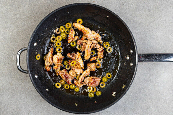 Das Fleisch trocken tupfen, in ca. 1cm breite Streifen schneiden und in der Pfanne mit 2EL Butter bei mittlerer Hitze 6–7Min. goldbraun braten. Den Knoblauch ca. 30Sek. mitbraten. Die ½ des Zitronensafts, die Oliven, 2EL Honig und 1TL Salz zugeben und alles weitere 4–5Min. garen, bis die klebrige Sauce das Fleisch vollständig bedeckt. Mit Salz und Pfeffer abschmecken.