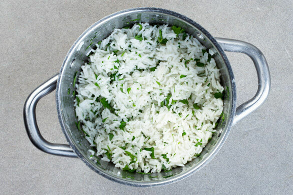 Den Backofen mit Grillfunktion auf 250°C vorheizen. In einem kleinen Topf 400ml leicht gesalzenes Wasser zum Kochen bringen. Den Reis in einem Sieb kalt abspülen, bis das Wasser klar bleibt. Sobald das Wasser kocht, den Reis hineingeben und abgedeckt bei niedrigster Hitze 10–12Min. kochen, bis das Wasser aufgesogen und der Reis gar ist. Noch ca. 5Min. ohne Hitzezufuhr ziehen lassen.