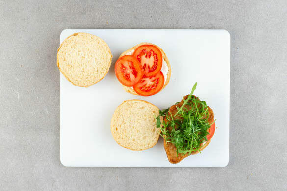 Die Brötchen aufschneiden und 2–3Min. im Ofen aufbacken. Die Tomate in dünne Scheiben schneiden. Die Brötchen mit der ½ der Käsecreme bestreichen und nach Belieben mit den Tomatenscheiben, den Schnitzeln und dem Rucola belegen.