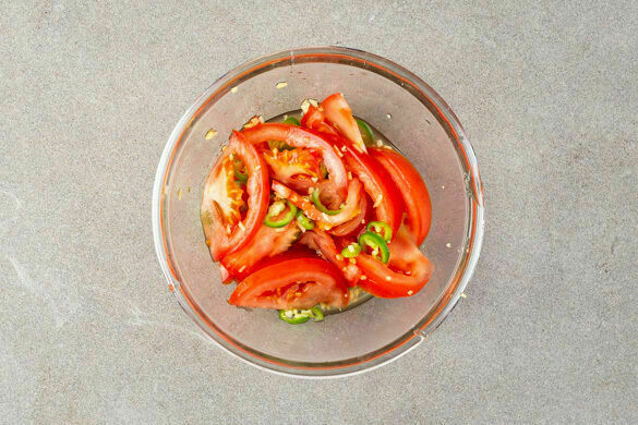 Den Ingwer schälen und fein reiben. Die Tomaten in dünne Spalten schneiden. Die Peperoni längs halbieren und in hauchdünne Streifen schneiden. Tipp: Für weniger Schärfe die Kerne entfernen. Die Tomaten, den Ingwer und die ½ der Peperoni oder mehr nach Geschmack mit 4EL hellem Essig und je ½TL Salz, Pfeffer und Zucker vermengen.