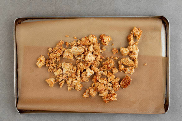Die veganen Hähnchenschnetzel auf ein mit Backpapier ausgelegtes Blech geben. Mit ca. ⅔ des Knoblauchs, dem Paprikapulver, dem Ahornsirup, 4EL Olivenöl und 1TL Salz vermengen, dann im vorgeheizten Ofen in 12–14Min. goldbraun und knusprig backen, dabei nach der Hälfte der Zeit wenden.