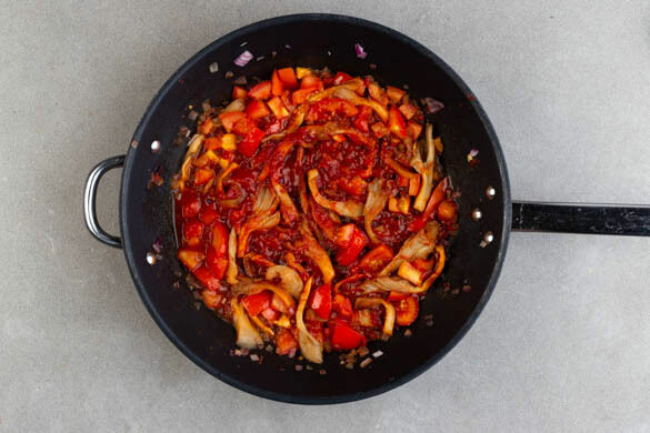 Die Austernpilze, die Zwiebeln und den restlichen Knoblauch in einer großen Pfanne mit 2EL Olivenöl bei mittlerer bis starker Hitze 2–3Min. anbraten, dann die Tomaten, das Tomatenmark, 200ml Wasser, 1TL Salz und 1TL Zucker einrühren und alles abgedeckt ca. 3Min. köcheln lassen.