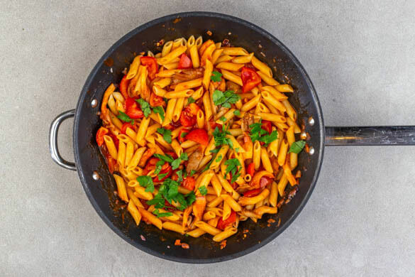 Dieses Gericht ist inspiriert von Pasta all’Amatriciana – einer italienischen Tomatensauce mit Guanciale, einem speziellen Speck. Wir haben eine vegane Version kreiert, für die vegane Hähnchenschnetzel von Heura als Speckersatz dienen. Das schmeckt keineswegs nach Verzicht, sondern nach Genuss! Das rauchig-würzige Aroma erhalten die Schnetzel durch geräuchertes Paprikapulver, die Knusprigkeit durch das Backen im Ofen. Lecker!