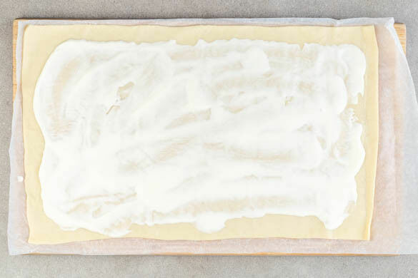 Den Teig mit dem Papier nach unten auf der Arbeitsfläche ausrollen und die ½ der Crème fraîche auf dem Teig verstreichen.
