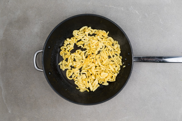 Inzwischen die Spätzle in einer zweiten großen Pfanne mit 1EL Pflanzenöl bei mittlerer Hitze ca. 5Min. goldbraun anbraten. Die Spätzle mit der Gemüse-Fleisch-Sauce anrichten und servieren.